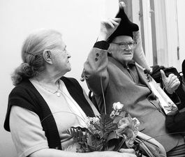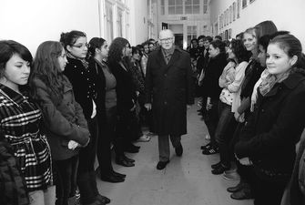 A mélységes tisztelet nyilvánult meg már a kedd délutáni ceremónia kezdetén is: az országos hírű tagozat jelenlegi diákjainak és tanárainak gyűrűjében és énekétől kísérve vonult be az idős házaspár a tágas táncterembe, úgy tűnt, némiképp megilletődve.